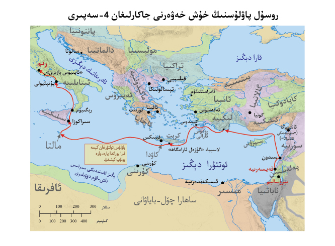 27:7 «شامال مىڭىش يۆنىلىشىمىزنى توسۇغاچقا، كرېت ئارىلىنىڭ شامالدىن دالدا تەرىپى بىلەن مېڭىپ، سالمونىي يېرىم ئارىلىدىن ئۆتۈپ... » ــ ئەسلىدە ئۇلار مەغرىپ تەرەپكە ماڭماقچى، ھازىر جەنۇبقا قاراپ ماڭىدۇ. «روسۇل پاۋلۇسنىڭ سەپەرلىرى» دېگەن خەرىتىنى كۆرۈڭ.