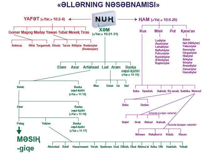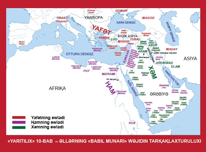 □10:1 «izaⱨat» — muxu babtiki nǝsǝbnamidiki bǝzi tǝpsilatlar wǝ nǝsǝbnamidiki yǝtmix ǝlning ⱨazirⱪi ⱪaysi ǝl ikǝnliki toƣruluⱪ «ⱪoxumqǝ sɵz»imizni, xundaⱪla munasiwǝtlik hǝritini kɵrüng. «Tɵwǝndikilǝr Nuⱨning oƣullirining ǝwladliridur: — » — muxu jümlǝ bilǝn «Alǝmning Yaritilixi»ning tɵtinqi «tolidot»i («tarihi»), yǝni «Nuⱨning oƣullirining tolidoti» («Nuⱨning oƣullirining ǝwladlirining tarihi») (10:1-11:9) baxlinidu.