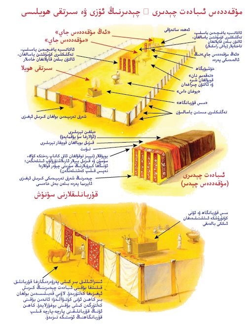 31 سەن نېپىز توقۇلغان ئاق كاناپ رەختكە كۆك، سۆسۈن ۋە قىزىل يىپلار ئارىلاشتۇرۇلۇپ ئىشلەنگەن بىر پەردە ياسىغىن؛ ئۇنى چېۋەر قوللار كېرۇبلارنىڭ سۈرىتىنى نەپىس قىلىپ چۈشۈرۈپ كەشتىلەپ چىقسۇن. مىس. 36‏:35 32 ئۇنى ئاكاتسىيە ياغىچىدىن ياسالغان تۆت خادىغا ئېسىپ قويغىن. بۇ خادىلار ئالتۇن بىلەن قاپلانسۇن، ھەربىرىنىڭ ئالتۇن ئىلمىكى بولسۇن؛ خادىلار كۈمۈشتىن ياسالغان تۆت تەگلىككە ئورنىتىلسۇن. 33 پەردە چېدىر يوپۇقىدىكى ئىلمەكلەرگە ئېسىلىپ ساڭگىلىتىپ قويۇلسۇن؛ ئاندىن ھۆكۈم-گۇۋاھلىق ساندۇقىنى شۇ يەرگە كەلتۈرۈپ، پەردىنىڭ ئىچىگە ئېلىپ كىرگىن. شۇنىڭ بىلەن پەردە سىلەر ئۈچۈن مۇقەددەس جاي بىلەن ئەڭ مۇقەددەس جاينىڭ ئوتتۇرىسىدىكى بىر ئايرىما پەردە بولسۇن. 34 ئاندىن سەن «كافارەت تەختى»نى ئەڭ مۇقەددەس جايدىكى ھۆكۈم-گۇۋاھلىق ساندۇقىنىڭ ئۈستىگە قويغىن.