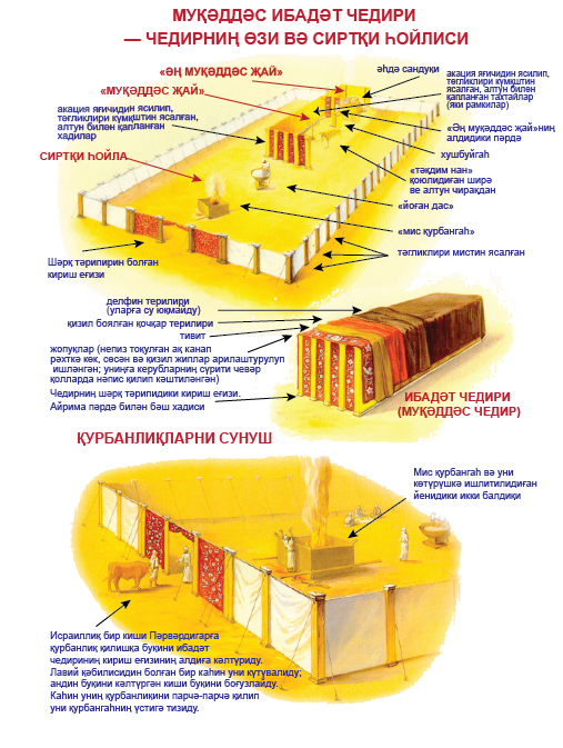 Андин у чедирниң һойлисиниму ясиди. Һойлиниң җәнубиға, йәни җәнупқа йүзләнгән тәрипигә непиз тоқулған ақ канап рәхттин пәрдиләрни ясиди; униң узунлуғи йүз гәз еди. Мис. 27:9 10 Пәрдиләрни есишқа жигирмә хада вә хадиларниң жигирмә тәглигини у мистин ясиди. Хадиларниң илмәклири вә балдақлири күмүчтин ясалған еди.