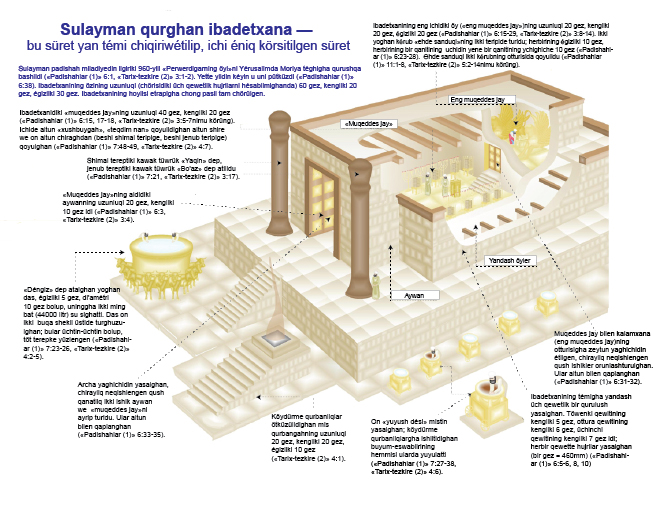 □6:38 «layihe boyiche pütünley tamam boldi» — mushu yerde «layihe» belkim Dawut Muqeddes Rohning körsetmisi arqiliq aldin körsetken sxémisini körsitidu «1Tar.» 28:19).