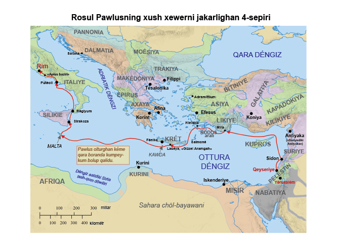 16-17 Klawda dégen kichik bir aralning shamalgha dalda teripige ötüwélip, qolwaqni kémige chiqiriwélip, aranla uni saqlap qalaliduq. Andin kémichiler kémini arghamchilar bilen sirtidin orap baghliwaldi. Kémining Sirtis dep atalghan déngiz astidiki tash-qum döwilirige qéqilip pétip qélishidin qorqup, tormuz lenggerlirini chüshürüp, kémini shamalning heydishige qoyup berdi.
