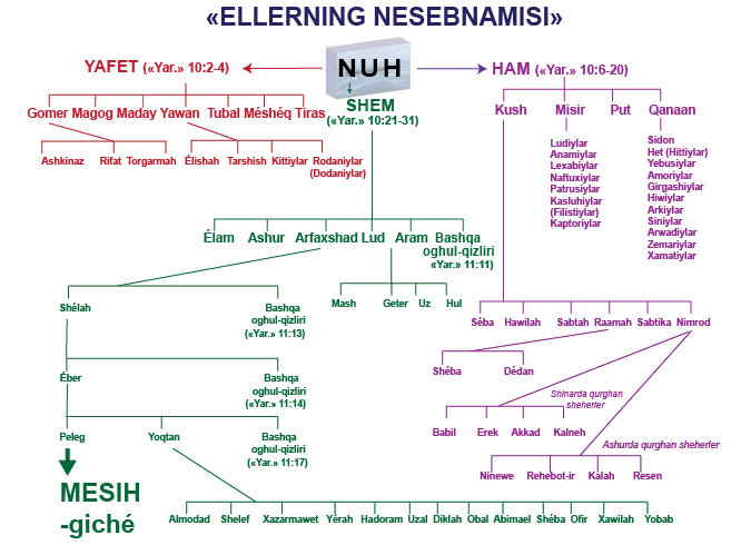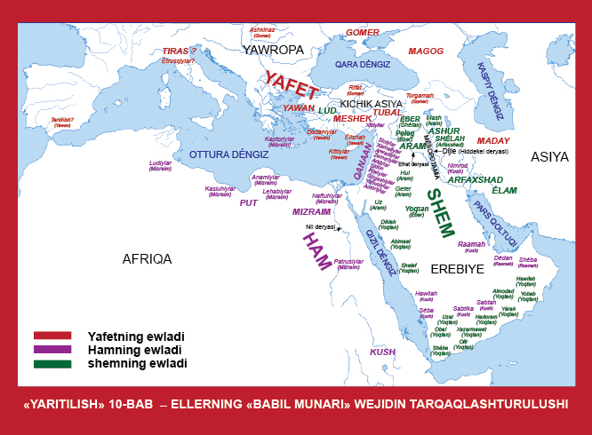 □10:1 «izahat» — mushu babtiki nesebnamidiki bezi tepsilatlar we nesebnamidiki yetmish elning hazirqi qaysi el ikenliki toghruluq «qoshumche söz»imizni, shundaqla munasiwetlik xeritini körüng. «Töwendikiler Nuhning oghullirining ewladliridur: — » — mushu jümle bilen «Alemning Yaritilishi»ning tötinchi «tolidot»i («tarixi»), yeni «Nuhning oghullirining tolidoti» («Nuhning oghullirining ewladlirining tarixi») (10:1-11:9) bashlinidu.