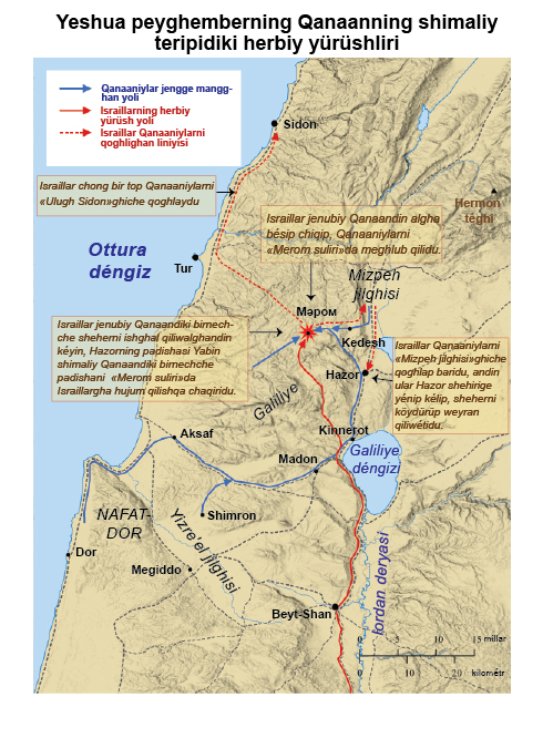 1 Emma Hazorning padishahi Yabin bularni anglap Madonning padishahi Yobab bilen Shimronning padishahi we Aqsafning padishahigha adem ewetti, 2 shundaqla shimaldiki taghliq rayondiki padishahlargha, Kinnerotning jenubidiki tüzlenglik, oymanliq we gherbtiki Dor égizlikidiki hemme padishahlargha elchi ewetti; □ «Dor égizliki» — yaki «Nafat-Dordiki». 3 U yene sherq bilen gherb tereptiki Qanaaniylar, Amoriylar, Hittiylar, Perizziyler bilen taghliq rayondiki Yebusiylar we Hermon téghining étikidiki Mizpah yurtida turuwatqan Hiwiylarni chaqirdi. 4 Ular, yeni padishahliri we barliq qoshunliri chiqti; ularning sani déngiz sahilidiki qumdek köp idi, ularning nurghun at we jeng harwiliri bar idi. 5 Bu hemme padishahlar bir bolup yighilip, Israil bilen jeng qilish üchün Merom sulirining boyida chédirlarni tikti.