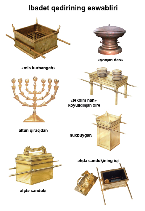 ■ 3 U ⱪurbangaⱨning barliⱪ ǝswablirini — uningƣa has bolƣan daslarni, gürjǝklǝrni, korilarni, lahxigirlarni wǝ otdanlarnimu yasidi; uning barliⱪ ǝswablirini mistin yasidi.