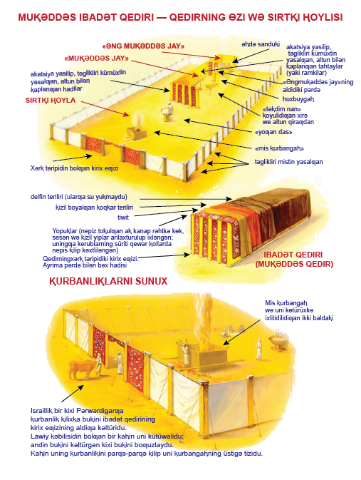 24 Muⱪǝddǝs qedirni yasaxⱪa ixlitilgǝn altun, yǝni «pulanglatma ⱨǝdiyǝ» süpitidǝ kǝltürülgǝn altunning ⱨǝmmisi muⱪǝddǝs jaydiki xǝkǝlning ɵlqǝm birliki boyiqǝ yigirmǝ toⱪⱪuz talant yǝttǝ yüz ottuz xǝkǝl idi.