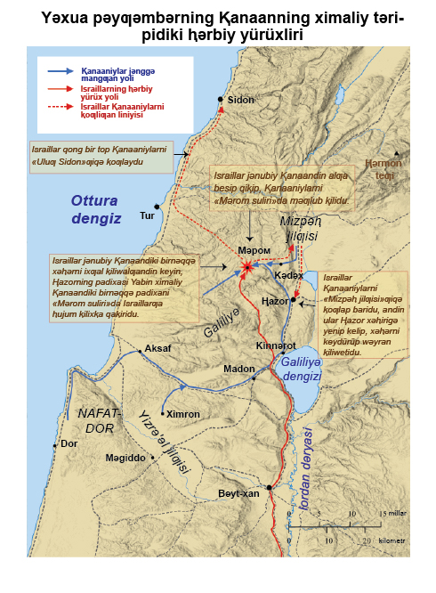 1 Əmma Ⱨazorning padixaⱨi Yabin bularni anglap Madonning padixaⱨi Yobab bilǝn Ximronning padixaⱨi wǝ Aⱪsafning padixaⱨiƣa adǝm ǝwǝtti, 2 xundaⱪla ximaldiki taƣliⱪ rayondiki padixaⱨlarƣa, Kinnǝrotning jǝnubidiki tüzlǝnglik, oymanliⱪ wǝ ƣǝrbtiki Dor egizlikidiki ⱨǝmmǝ padixaⱨlarƣa ǝlqi ǝwǝtti; □ «Dor egizliki» — yaki «Nafat-Dordiki». 3 U yǝnǝ xǝrⱪ bilǝn ƣǝrb tǝrǝptiki Ⱪanaaniylar, Amoriylar, Ⱨittiylar, Pǝrizziylǝr bilǝn taƣliⱪ rayondiki Yǝbusiylar wǝ Ⱨǝrmon teƣining etikidiki Mizpaⱨ yurtida turuwatⱪan Ⱨiwiylarni qaⱪirdi. 4 Ular, yǝni padixaⱨliri wǝ barliⱪ ⱪoxunliri qiⱪti; ularning sani dengiz saⱨilidiki ⱪumdǝk kɵp idi, ularning nurƣun at wǝ jǝng ⱨarwiliri bar idi. 5 Bu ⱨǝmmǝ padixaⱨlar bir bolup yiƣilip, Israil bilǝn jǝng ⱪilix üqün Mǝrom sulirining boyida qedirlarni tikti.
